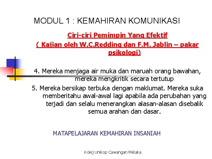 MODUL 1 : KEMAHIRAN KOMUNIKASI Ciri-ciri Pemimpin Yang Efektif ( Kajian oleh W. C. Redding dan F. M. Jablin – pakar psikologi) 4. Mereka menjaga air muka dan maruah orang bawahan, mereka mengkritik secara tertutup 5. Mereka bersikap terbuka dengan maklumat. Mereka suka memberitahu awal-awal lagi apabila ada perubahan yang terjadi dan selalu menerangkan alasan-alasan disebalik semua arahan dasar. MATAPELAJARAN KEMAHIRAN INSANIAH Kolej Unikop Cawangan Melaka