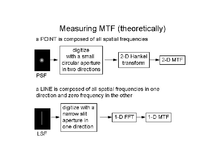 • Frequency and space (time) are convertible to each other. Therefore, taking Fourier Transform of LSF we get MTF. h(x, y)=LSF