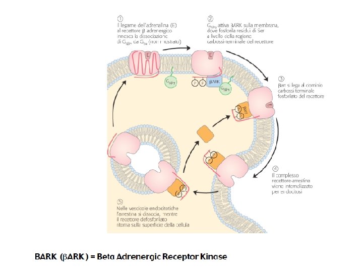 βARK (β-Adrenergic Receptor Kinase): Appartiene alla famiglia delle chinasi dei rec accoppiati a prot G (GRK): capaci di fosforilare esclusivamente il recettore occupato dall’agonista. Localizzato nel citoplasma, viene traslocato alla membrana a seguito di attivazione del recettore interazione con complessi β di prot Gs. R Traslocazione di βARK dal citoplasma alla membrana P-azione Ser e Thr sul C-term Legame della βarrestina al rec Blocco dell’interazione con prot G (desensitizzazione omologa)
