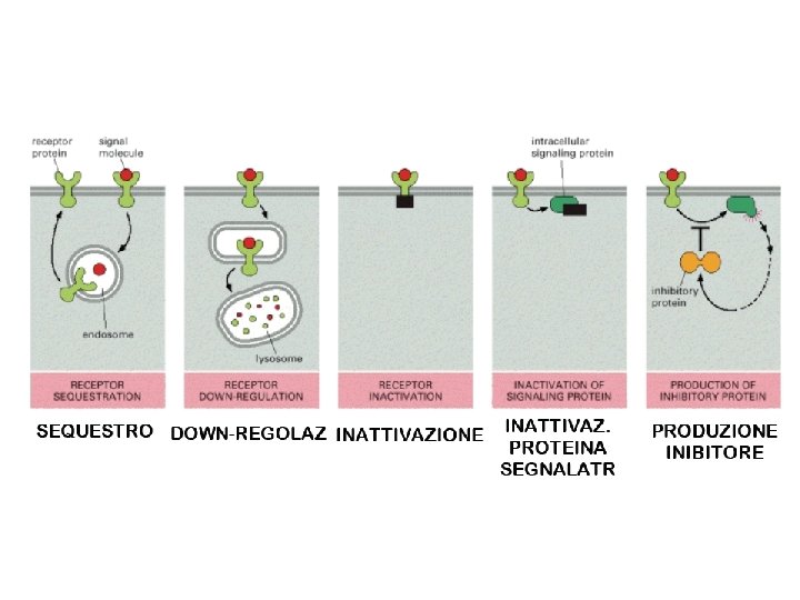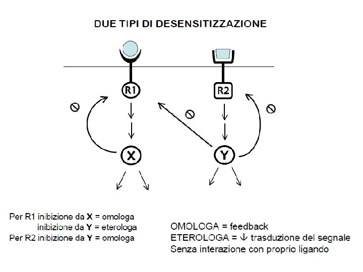 DESENSITIZZAZIONE Riduzione delle risposte recettoriali dovuta a trattamento prolungato con agonisti Desensitizzazione dall’agonista omologa: riguarda il recettore di superficie attivato Desensitizzazione eterologa: l’attivazione prolungata di un sistema recettoriale induce desensitizzazione di altri recettori che utilizzano la stessa via di trasduzione del segnale o gli stessi effettori (es. GPCRs) Meccanismi di desensitizzazione: - < n° recettori (< Bmax) = down-regulation - < affinità (> Kd) - incapacità di trasdurre il segnale