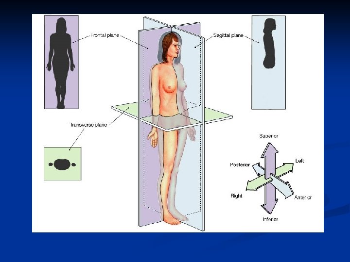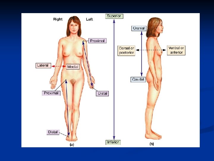 n n Anatomical Terminology Relative Positions: 1. Terms of relative position are used to describe the location of a part relative to another part. 2. Terms of relative position include: superior, inferior, anterior, posterior, medial, lateral, proximal, distal, superficial (peripheral), and deep.