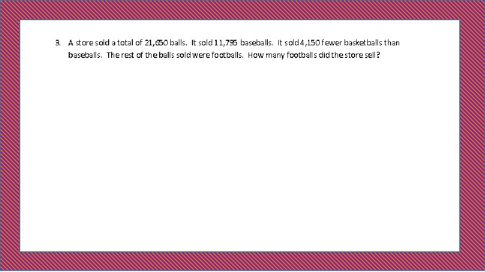 C Problem 1 11, 650 m S ? 4, 950 W 3, 500 1. Model the problem. Step 1 Work Space Solve a multi-step word problem, requiring addition and subtraction, using a tape diagram, checking the reasonableness of the answer using estimation. In one year, a factory used 11, 650 meters of cotton, 4, 950 fewer meters of silk than cotton, and 3, 500 fewer meters of wool than silk. How many meters in all were used of the three fabrics? 2. Calculate to solve and write a statement. Step 2 Work Space Lesson 18 How can you know if your answer is a reasonable answer? 3. Assess the solution for reasonableness. Step 3 Work Space