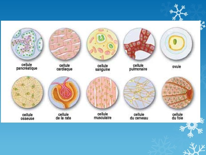 Theme 5: La spécialisation et l’organisation des cellules organismes multicellulaires se développent à partir d’une seule cellule qui se divise. Cependant, les cellules d’un organismes ne sont pas toujours pareilles. Les différentes cellules n’ont pas la même fonction ou apparence; elles sont des cellules spécialisés pour des tâches spécifiques. Les humains ont environ 100 types de cellules et chaque type a une fonction différente.