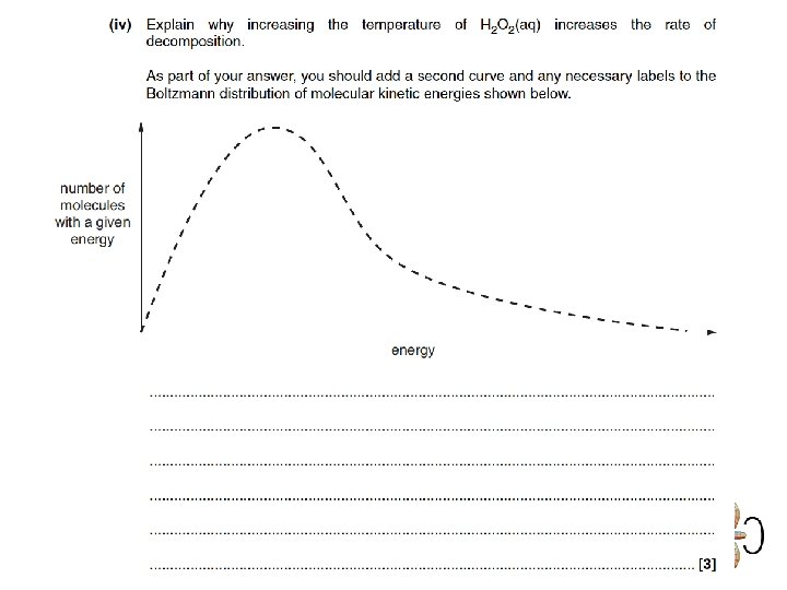 Homework – essay question An experiment is conducted to measure the rate of hydrogen peroxide decomposition. Using collision theory and the Boltzmann distribution explain the following observations. • When the temperature is raised by 20°C from 20°C to 40°C the rate increases to more than four times the original rate. • A catalyst is tested at 40°C which increases the rate of reaction still further to double the previous rate • Heating the mixture containing the catalyst still further to 50°C caused the reaction rate to fall. [10 marks]
