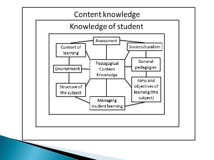 �Knowledge of representations of subject matter (content knowledge); �Knowledge of students �Understanding of students’ conceptions of the subject; �General pedagogical knowledge; �Curriculum knowledge; �Knowledge of educational contexts; and �Knowledge of the purposes of education.
