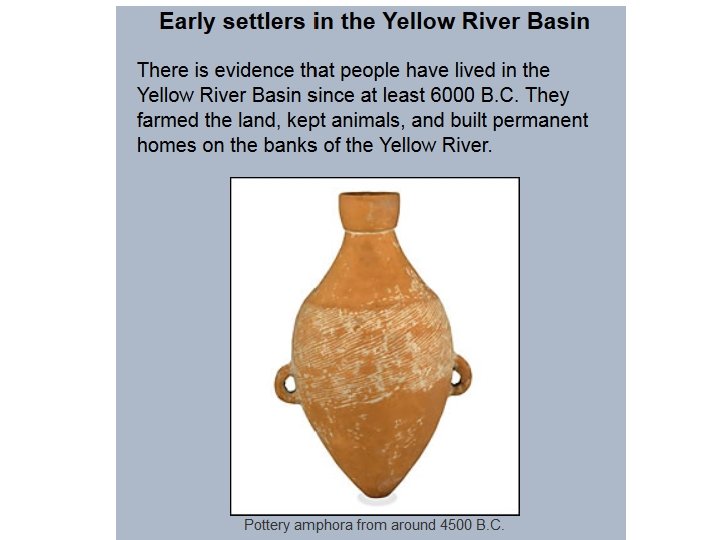 Huts of Banpo Matriarchal Clan Community - 5600– 6700 BC • Found in the Yellow River Valley – this photo is a recreation • The houses were circular, built of mud and wood with overhanging thatched roofs. • They sat on low foundations • The site was surrounded by a ditch or defensive moat
