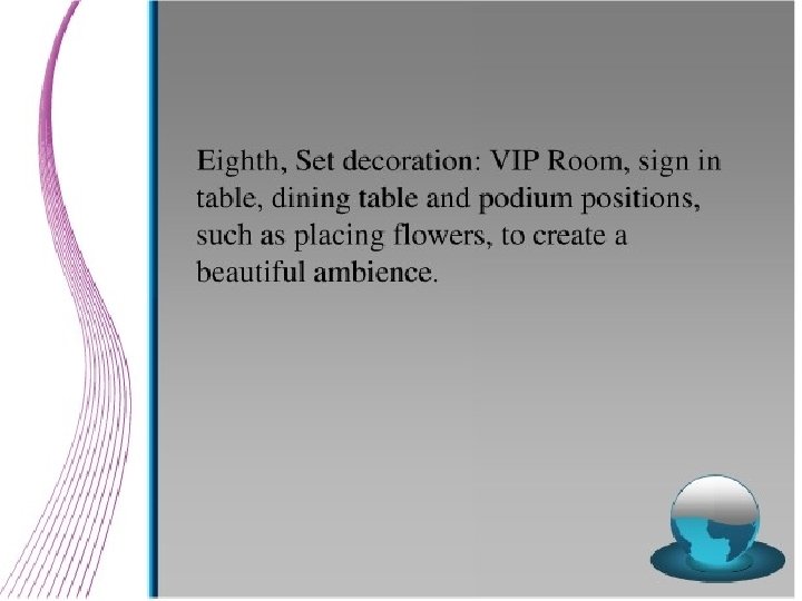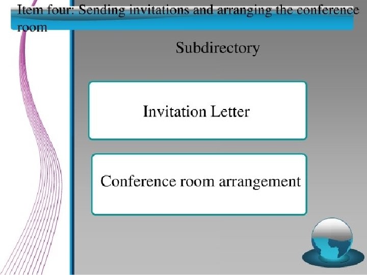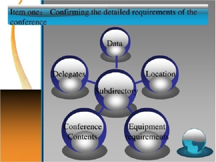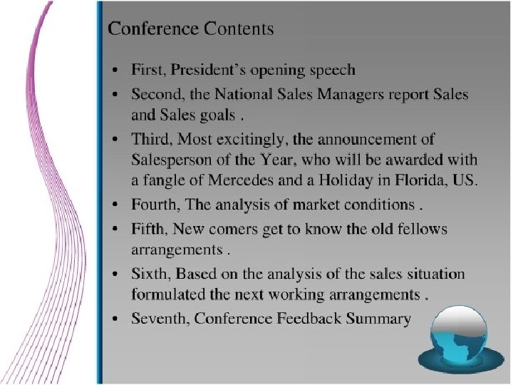 Any logical order n n n n Decide on the budget Decide on the duration Arrange a date Choose a location Invite the delegates Finalize the program details Organize the equipment required (e. g. , overhead projector etc. )