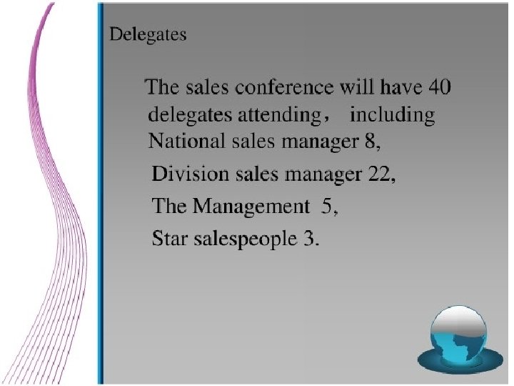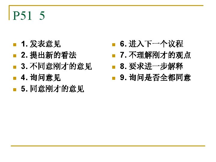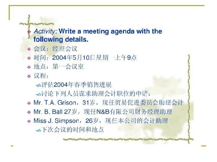 Various meetings 各种类型的会议 n n n n n Staff meeting 部门经理的管理层会议 Project meeting 讨论项目进展的项目会议 Budgeting meeting 讨论预算的预算会议 Teleconference call 与美国总部的电话会议 Video conference 利用视频会议系统 Net-meeting 网络会议 Weekly meeting 周会 Monthly meeting 月例会 Quarterly meeting 季度会议 Annual meeting 年度会