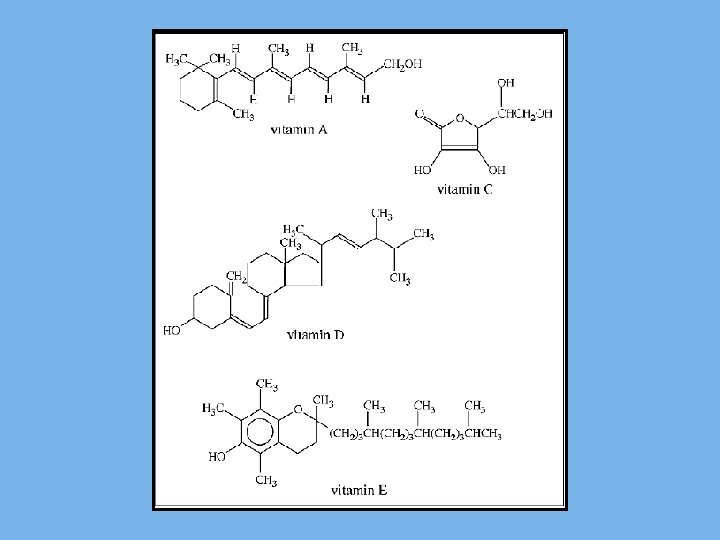 Molecules of Food: Vitamins • Essential organic compounds to ensure proper metabolism • Little caloric value • Water-soluble vitamins (enter directly into bloodstream) • Fat-soluble vitamins (must be transported by carrier proteins) • Several diseases are associated with vitamin deficiencies