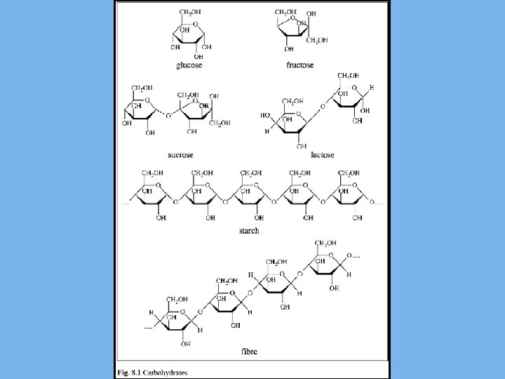 Molecules of Food: Carbohydrates v 6 -C rings, 5 -C rings v. Mono-saccharides (sugar, fructose) Dissacharides (lactose, sucrose) Polysaccharides (starch, fibre, glycogen) v. Carbohydrates are assimilated in the body as “mono-saccharides” following digestion