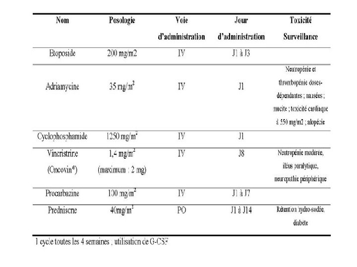 indication Stades localisés: I et II (classification d’Ann Arbor) → chimiothérapie (ABVD*), 3 ou 4 cures + irradiation des territoires ganglionnaires initialement atteints Stades disséminés (III et IV) ; chimiothérapie exclusive (ABVD ou BEACOPP**), 6 à 8 cures Une évaluation de la réponse au traitement à mi-parcours et en fin de traitement est réalisée Résultat: Stade localisé : 90% rémission complète (RC)avec 95 % survie sans rechute à 10 ans. Stade étendu : 85 % de RC mais les rechutes restent fréquentes avec 80% de survie sans rechute à 7 ans.