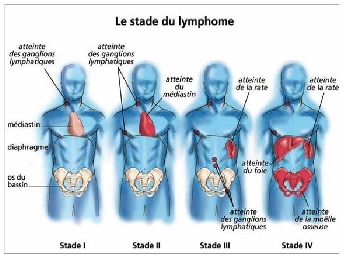 4 - bilan d’évolutivité : les signes généraux 1 - Fièvre inexpliquée (sans preuve infectieuse) >38 °C de plus de 1 semaine 2 - Sueur profuse nocturne 3 - Amaigrissement importante de plus de 10 % du poids du corps dans les 6 mois qui précède. 5 - Classification de ANN ARBOR: Stade I atteinte d’un seul territoire ganglionnaire Stade II Atteinte deux ou plus de territoires ganglionnaires de même coté du diaphragme. Stade III Atteinte ganglionnaire de part et d’autre du diaphragme Stade IV Atteinte d’un ou plusieurs viscères (Moelle, Foie, poumon) avec ou sans atteinte ganglionnaire associée. A: absence des signes généraux B: présence un ou plus de signes généraux S: atteinte splénique X: masse tumorale importante (IMT>0, 35 ou ADP volumineuse > 10 cm) dite BULKY E: atteinte d’un seul viscère contigu