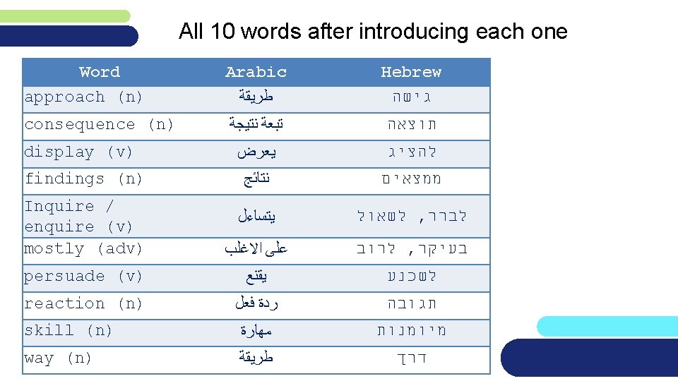 Module E pilot Mini vocabulary lesson 16 of 40 Jessica Goldshlager Kamir approach (n) consequence (n) display (v) findings (n) inquire / enquire (v) mostly (adv) persuade (v) reaction (n) skill (n) way (n)