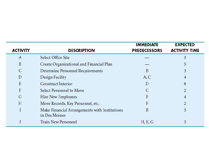 ` The systems group and the treasurer’s office must organize and implement the operating procedures and the financial arrangements for the new operation. The architects will have to design the interior space and oversee needed structural improvements. Each of the sites that Global is considering is an existing building with the appropriate amount of open space. However, office partitions, computer facilities, furnishings, and so on must all be provided. A second complicating factor is that there is an interdependence of activities. In other words, some parts of the project cannot be started until other parts are completed. Consider two obvious examples: Global cannot construct the interior of an office before it has been designed. Neither can it hire new employees until it has determined its personnel requirements.