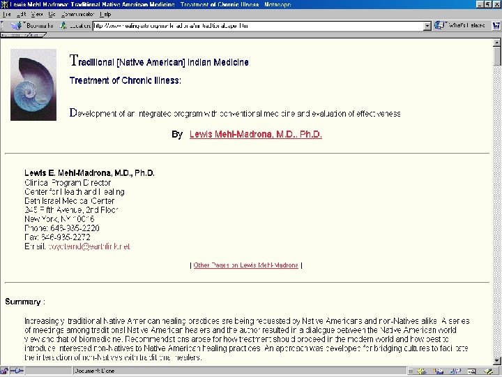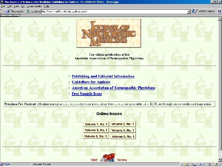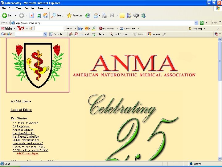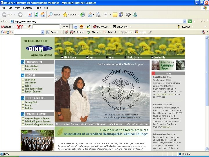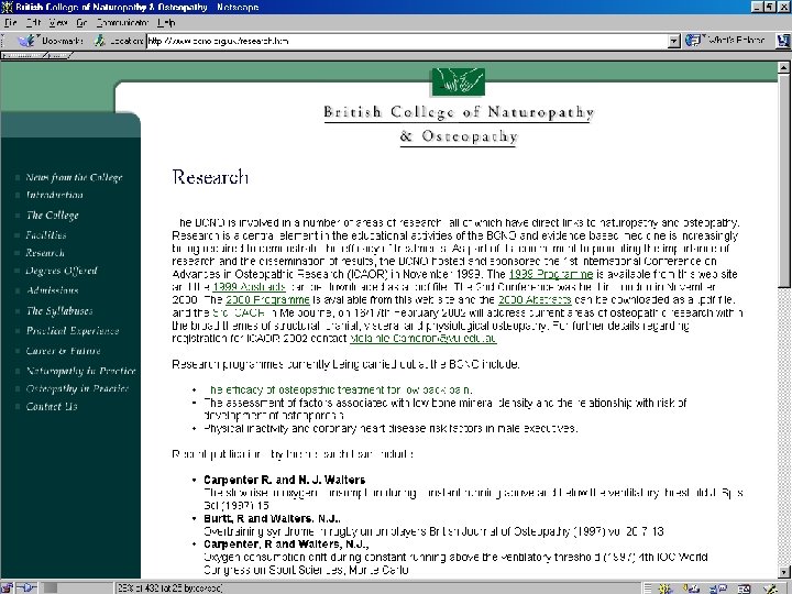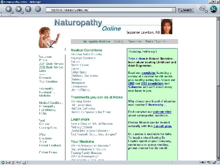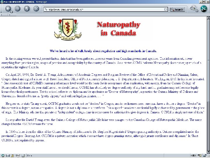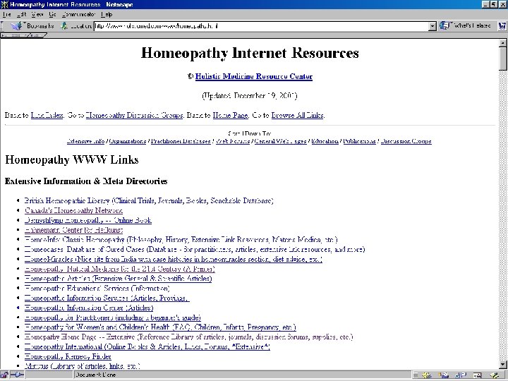 Research • Because it’s eclectic, research is on branches of Naturopathy • Ex: how natural dietary remedies have increased by about 28% in Sweden in last two decades [ meta analysis, Johannsen, J of Internal Med, Aug 2001 ] • Descriptive studies that look at cost and satisfaction factors of Nat as form of CAM