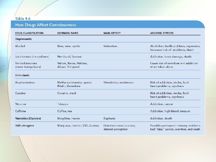 Stimulants • Stimulants: drugs increase the LO 4. 8 How Do Stimulants and Depressantsthat Affect Consciousness? functioning of the nervous system • amphetamines: drugs that are synthesized (made in labs) rather than found in nature • cocaine: natural drug; produces euphoria, energy, power, and pleasure • nicotine: active ingredient in tobacco