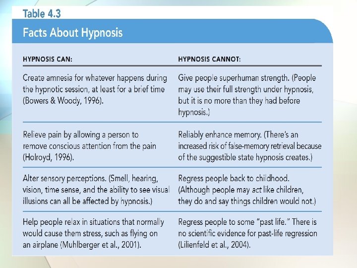 Hypnosis: “Symptoms” • When hypnotized, people’s awareness may be characterized by: • • • Enriched fantasy, Cognitive passivity, Hyperselective attention, Reduced reality testing Posthypnotic amnesia.