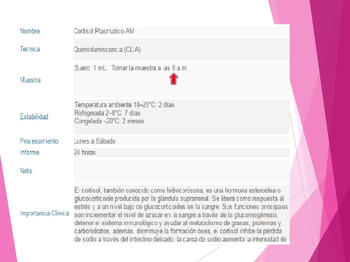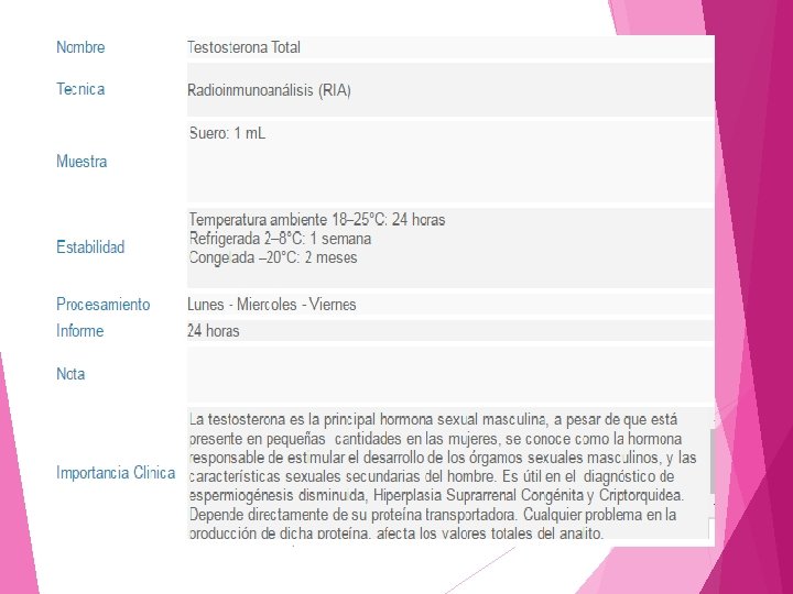 FUNCION HIPOFISIARIA SUERO Secretadas por la hipófisis (glándula pituitaria) ü FSH (Hormona Foliculo Estimulante) En la mujer la FSH estimula el crecimiento y el reclutamiento de los folículos ováricos inmaduros en el ovario ü LH (Hormona Luteinizante) Útil en la evaluación de disfunción gonadal, ovulación e infertilidad. El LH se eleva en niños con pubertad prematura, en mujeres con síndrome de ovario poliquístico, en la menopausia prematura, castración, insuficiencia testicular ü HGH (Hormona de Crecimiento) En ayunas. Completo reposo 30 minutos antes de la toma de la muestra. La hormona de crecimento es utilizada en la evaluación del niño de estatura pequeña especificamente para diferenciar la producción baja de hormona de crecimiento de otras causas ü Prolactina En ayunas, tomar dos horas después de levantar Segregada estimula la producción de leche en las glándulas mamarias. En toda paciente con galactorrea, trastornos menstruales, hirsutismo, disminución de la libido o infertilidad