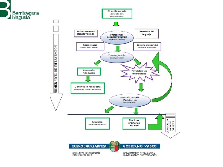 PROCEDIMIENTO PARA LA VALORACIÓN PSICOPEDAGÓGICA DEL ALUMNADO QUE PUDIERA PRESENTAR N. E. Es Por todo ello y para estos casos, el protocolo de actuación será el siguiente: 1. El tutor/a, ante indicios de problemática anteriormente señalada, una vez informada la familia, lo comunicará al consultor/a u /(en centros privados concertados, a la dirección, psicólogo/a o persona en la que éstos deleguen), que actuará de la siguiente manera: Realizando una primera aproximación a la comprensión de la dificultades mediante la recogida de información y valoraciones pedagógicas que considere oportunas. Estableciendo, si procede, las primeras medidas de intervención para actuar ante los problemas detectados 2. Si a pesar de realizados estos pasos, no se alcanzara a comprender la dimensión del problema, esta persona consultor/a u orientador/a, antes de que el tutor/a plantee a los padres la necesidad de solicitar asesoramiento psicopedagógico, expondrá el caso a la asesoría de NEEs del Berritzegune correspondiente. En ese caso se decidirá la pertinencia (o no) de cumplimentar la solicitud de valoración.