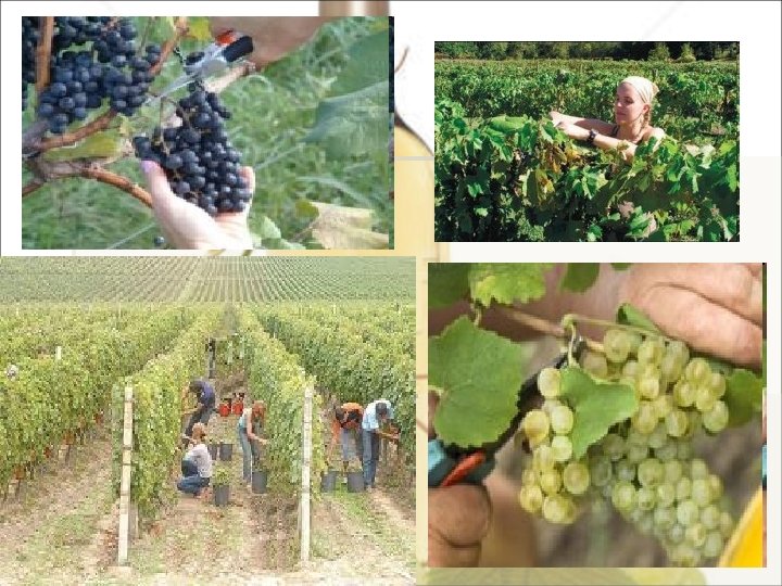 Recoltarea strugurilor § Stabilirea momentului recoltării § Strugurii pentru vin se recoltează la maturitatea tehnologică, respectiv momentul în care prezintă caracteristicile de compoziţie şi de calitate (conţinut de zahăr, aciditate, substanţe colorate la soiurile negre, aromă la cele aromate), necesare obţinerii unui anumit tip de vin. § Pe cale grafică se stabileşte momentul maturităţii depline şi se decide asupra celui de recoltare. În acest scop, din 5 în 5 zile după pârgă, se recoltează probe şi se determină greutatea a 100 boabe, conţinutul în zaharuri şi aciditatea. § Cu datele obţinute se întocmeşte un grafic şi se stabileşte momentul maturităţii depline §