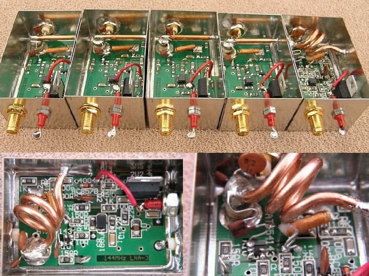 Budowa LNA OZ 1 PIF według OK 1 VPZ - wyniki • Wejściowy obwód rezonansowy jest uziemniony od zimnego końca, natomiast gorącą stroną jest podłączony do bramki tranzystora poprzez dodatkowy kondensator. Jego optymalna wartość, dobrana na zasadzie prób, wynosi ok. 5. 6 p. F dla 432 MHz i 10 -12 p. F dla 144 MHz. Napięcie polaryzujące bramkę FET-a jest, jak widać, podłączone poprzez dławik powietrzny. Jest on nawinięty drutem około 0, 25 mm na średnicy 2 mm (ok. 30 zwojów). Tych kilka zdjęć jest lepsze niż długi opis. • Współczynnik szumów (NF) tak wykonanych LNA spadł poniżej 0, 5 d. B dla obu pasm. Kilka LNA miało nawet poniżej 0, 45 d. B. Jednak przy pomiarach tak niskich NF ważne jest użycie bardzo dobrych złącz oraz redukcji zarówno przy pomiarach jak i przy kalibracji (być może z tego powodu pojawiają się wyniki poniżej 0, 2 d. B, hi). Radzę wszystkim wierzącym w swoje pomiary szumów przeczytać artykuly http: //www. rfham. com/g 8 mbi/preamp. htm jak również wyniki pomiarów w publikacji EME Newsletter K 2 UYH: http: //www. nitehawk. com/rasmit/NLD/eme 1010. pdf