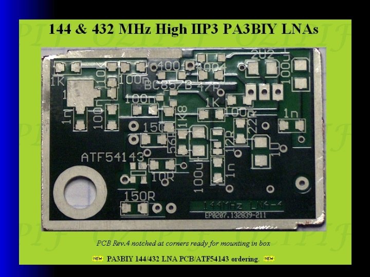 Jaki LNA ? • Czas to pieniądz i nie czułem potrzeby konstruowania takiego wzmacniacza od podstaw. W internecie opisanych jest sporo tego typu rozwiązań. Wybrałem układ LNA, który był sprawdzony, z IP 3 ponad 10 d. Bm i o prostej budowie elektrycznej i mechanicznej • Wybor tranzystora był w miare prosty – zwyciężył dobrze znany ATF 54143 firmy Avago. Przy rozsądnej cenie i wyśmienitych parametrach jest on relatywnie łatwo dostępny od różnych dystrybutorów (np. Farnell). • Drugim kryterium był współczynnik odbicia na wejściu. Dlatego finalny wybor padł na LNA w wykonaniu OZ 1 PIF. Jest on używany przez wielu entuzjastów EME i stanowi on najlepsze rozwinięcie konstrukcji PA 3 BIY, opisanej w Dubusie (co jest dla mnie świadectwem jakości). • Peter OZ 1 PIF sprzedał z sukcesem setki sztuk, zatem to rozwiązanie jest w pełni sprawdzone. Rzecz była prosta – dostępne były płytki oraz metatowe obudowy dla LNA na 432 i 144 MHz.