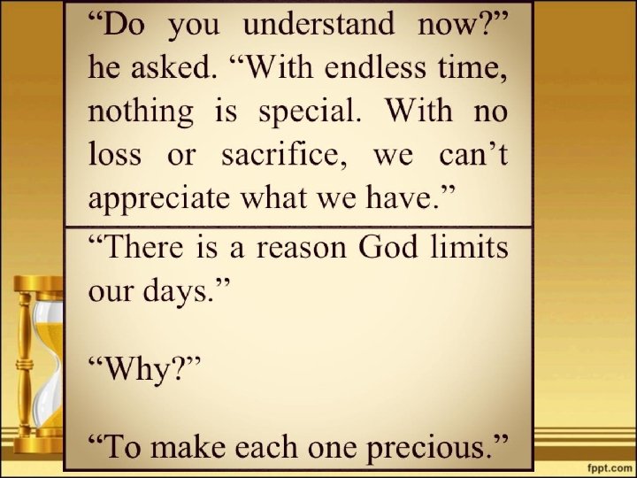 Ang bawat tao ay nakaasa sa panahon. Ang lahat ng naandito sa mundo ay dikta ng oras. May nakatakda kung kailan at kung anong oras dapat matapos ang gawain.