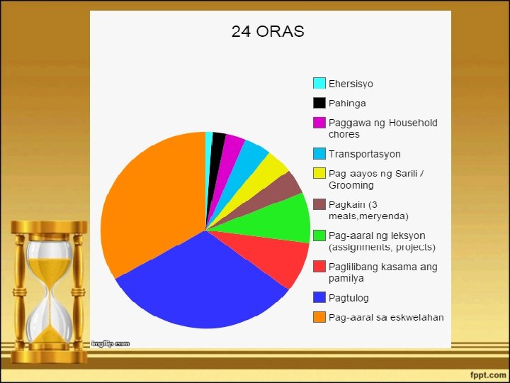 Sagutin: • 1. Anong kategorya sa mga gawain ang may malaking bahagi? Bakit? • 2. Napamahalaan mo ba nang wasto ang iyong oras? Kung oo, ano ang iyong isinaalang-alang para mapamahalaan mo ang iyong oras? Magbigay ng tunay na karanasan. • 3. Kung hindi ang sagot, ano ang naging balakid sa iyo para hindi mapamahalaan ang 24 oras? Magbigay ng makatwiran at matapat na paliwanag.