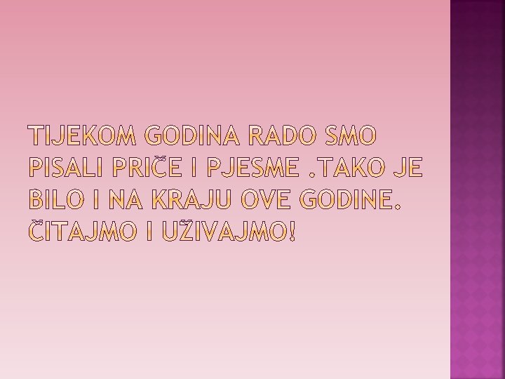 Ovo su naši zadnji dani u četvrtom razredu s našom učiteljicom. Sve četiri godine bilo je zabavno. Žalosno je što se moramo rastati od Učiteljice nakon toliko godina provedenih zajedno. Karlo Moja učiteljica Vesna, njoj cipela nije tijesna. Uz nju škola nije teška, jer kad dođe stalno se smješka. Ivan