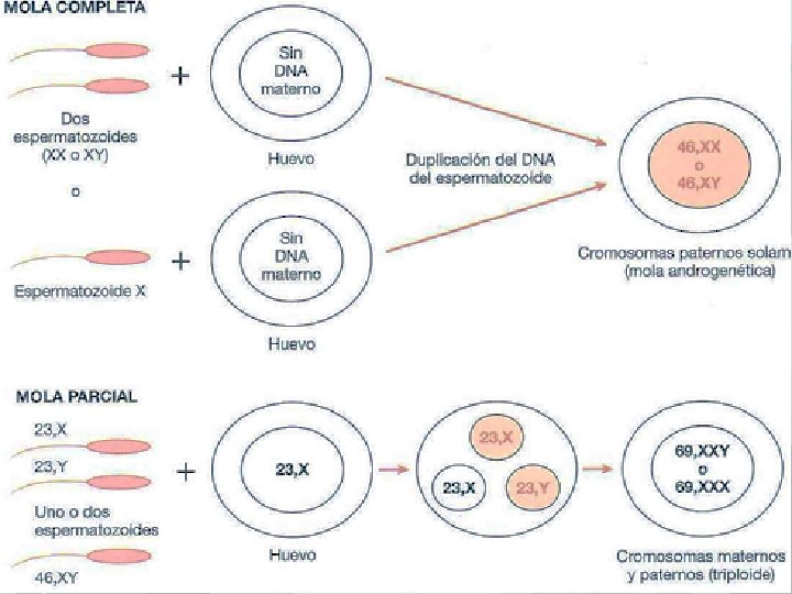 MOLA HIDATIFORME COMPLETA Ø Se origina da fertilização de um óvulo vazio com núcleo ausente, com carga genética somente do pai, um espermatozoide (23, X). Ø Ou de um óvulo fecundado por dois espermatozoides, (46, XX ou 46, XY).