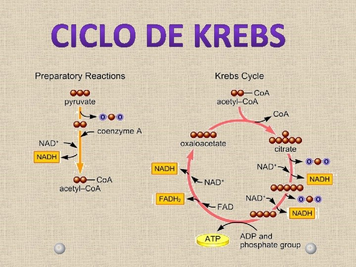 Ciclo de Krebs PRODUTOS FORMADOS NO CICLO DE KREBS POR CADA ÁCIDO PIRÚVICO NADH 2 1 FADH 2 3 1 ATP COMO SÃO 2 MOLÉCULAS DE ÁCIDO PIRÚVICO, O RESULTADO FINAL É: 6 NADH 2 2 FADH 2 2 ATP