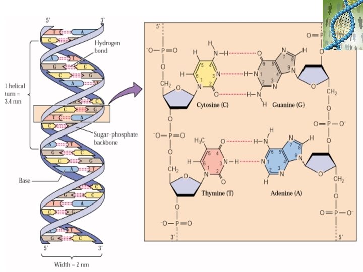 DNA – ÁCIDO DESOXIRRIBONUCLEICO • DNA: armazenamento e transmissão de genes • Cromossomos (núcleo), mitocôndria e cloroplastos • Duas cadeias em hélice em direções opostas anti-paralelas = ambas em sentido 5’ - 3’ • Fita dupla - Bases complementares ligadas por pontes de hidrogênio A - T (2) e G - C (3)