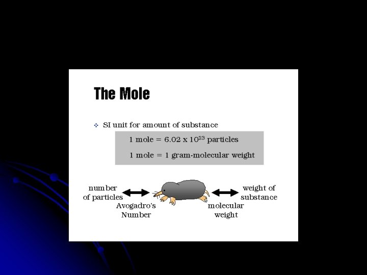 Atoms are so small that we cant visual them l So Chemists chose to use the term MOLE to represent amounts of matter l Matter being the number of l q Atoms q Particles q molecules