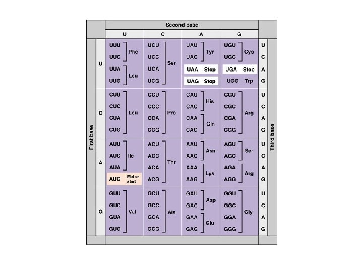 Translating nucleic acid language to polypeptides (chains of amino acids) • Nucleotides (A, T, C, G or A, U, C, G) are the alphabet • Translation code – Words made of 3 letters (triplets) = codons • Polypeptide language – Consists of 20 amino acids