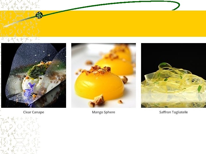 Tools for Molecular Gastronomy Molecular chefs require tools such as… Flasks of liquid nitrogen Syringes Tabletop distilleries p. H metres Food chemicals like carrageenan, maltodextrin, xanthan, sodium alginate, agar, calcium carbonate