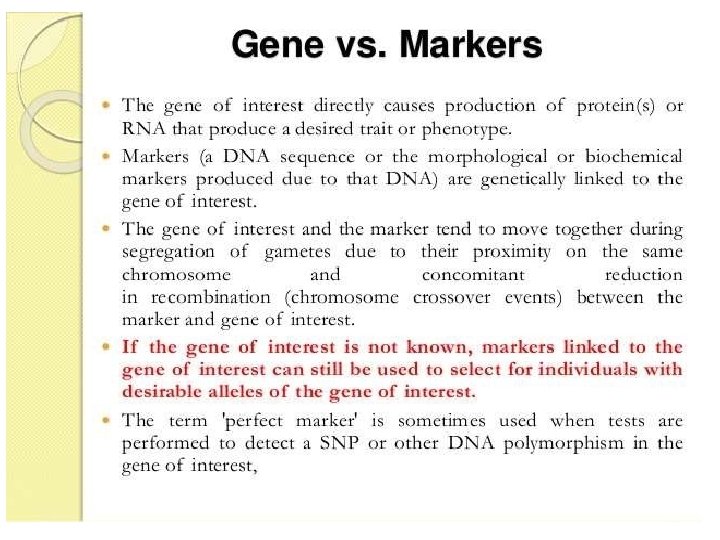 Genetic Markers • represent genetic differences between individual organisms or species • do not represent the target genes themselves but act as ‘signs’ or ‘flags • located in close proximity to genes (i. e. tightly linked) may be referred to as gene ‘tags • do not affect the phenotype of the trait of interest because they are located only near or ‘linked’ to genes controlling the trait • occupy specific genomic positions within chromosomes (like genes) called ‘loci’ (singular ‘locus’)