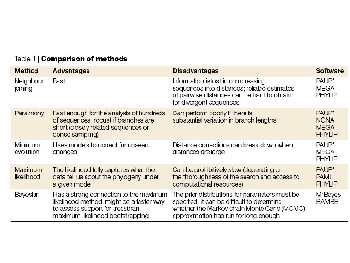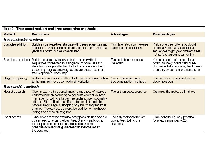 Inferring phylogenies • • • There also two fundamental ways of finding the “best” phylogenetic tree Clustering methods use some algorithm to cobble together a single tree Optimality methods survey all possible trees and compare how well they fit the data Clustering methods versus optimality methods