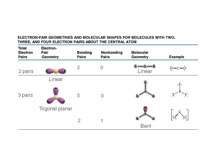 Predicting Molecular Geometries To determine the electron pair geometry: • draw the Lewis structure • count the total number of electron pairs around the central atom • arrange the electron pairs in one of the above geometries to minimize e--e- repulsion • multiple bounds count as one bonding pair