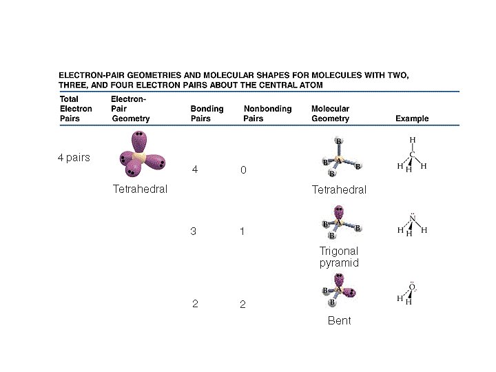 The Effect of Nonbonding Electrons and Multiple Bonds on Bond Angles • We determine the electron pair geometry only looking at electrons. • We name the molecular geometry by the positions of atoms. • We ignore lone pairs in the molecular geometry. • All the atoms that obey the octet rule have tetrahedral electron pair geometries.