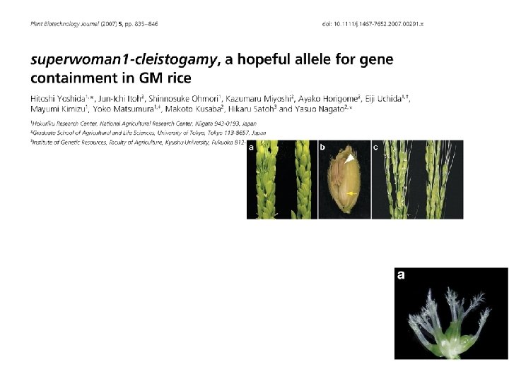 Molecular strategies for gene containment in transgenic crops Nature Biotechnology 20, 581 - 586 (2002) The potential of genetically modified (GM) crops to transfer foreign genes through pollen to related plant species has been cited as an environmental concern. Until more is known concerning the environmental impact of novel genes on indigenous crops and weeds, practical and regulatory considerations will likely require the adoption of gene-containment approaches for future generations of GM crops. Most molecular approaches with potential for controlling gene flow among crops and weeds have thus far focused on maternal inheritance, male sterility, and seed sterility. Several other containment strategies may also prove useful in restricting gene flow, including apomixis (vegetative propagation and asexual seed formation), cleistogamy (self-fertilization without opening of the flower), genome incompatibility, chemical induction/deletion of transgenes, fruit-specific excision of transgenes, and transgenic mitigation (transgenes that compromise fitness in the hybrid). As yet, however, no strategy has proved broadly applicable to all crop species, and a combination of approaches may prove most effective for engineering the next generation of GM crops.