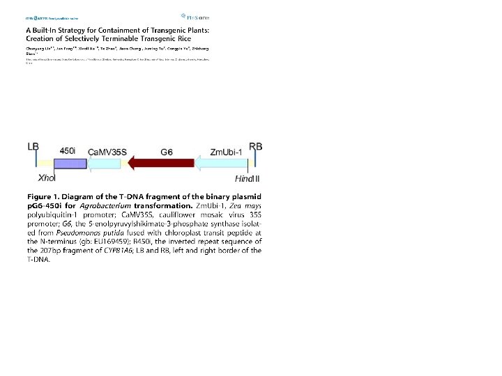 Temporal and tissue specific control Temporal Use chemically induced promoter to turn on the transgene. Many inducible promoters are available but only one (alcohol dehydrogenase) is commercialized so far. Spray the plants with the chemical to turn on the promoter and then spray with herbicide/ pesticide. This is not useful for those genes which need to be on through out the life cycle of plants. Tissue Specific Remove the transgene from non-target organs of the transgenic plant. This can be done by a two component system: 1). tissue specific promoter driving cre gene; 2). Transgenes flanked by the lox. P sites.