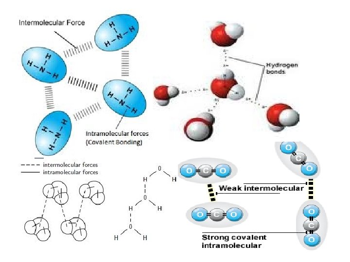Intermolecular and Intramolecular forces � Intermolecular � forces (IMF’s) Attraction between 2 or more compounds (compound another compound) � Intramolecular forces � Ionic attraction between cation/anions � Covalent Sharing valence electrons � Metallic Metals release electrons (alloys)