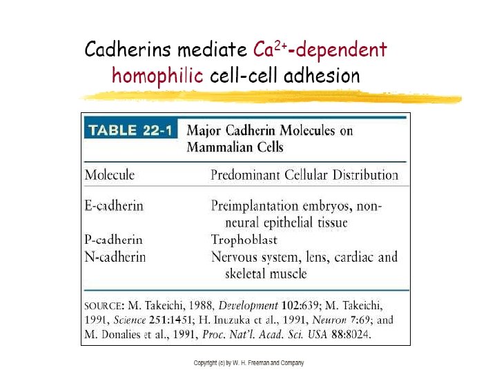 1. Cadherinas l Familia de 12 glucoproteínas, presente en la superficie de células epiteliales. l Molécula constituida por 700 -750 aa. l Median la adhesión célula-célula dependiente de Ca 2+. l Mecanismo homofílico.