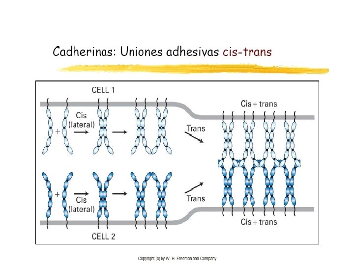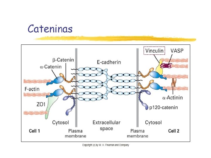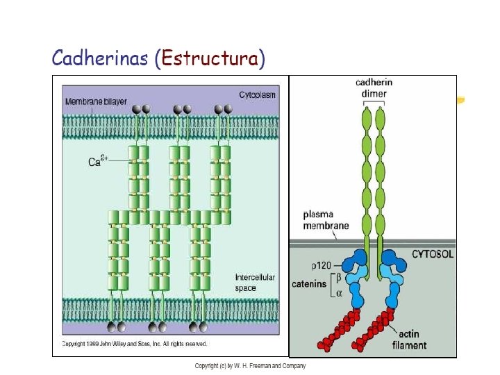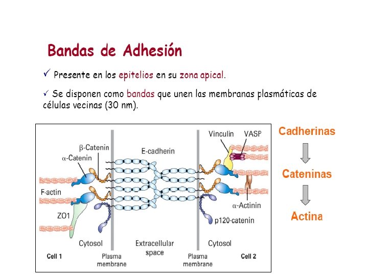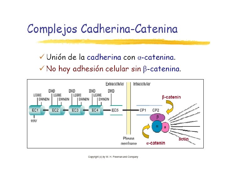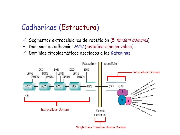 1. Cadherina l Presenta: l El dominio citoplasmático interactúa con actina por medio de tres proteínas de unión intracelular (cateninas) l. Un dominio transmembrana. l 5 dominios extracelulares, de los cuales 4 son homólogos entre sí.
