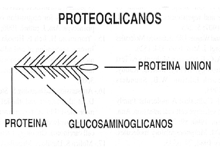 PROTEOGLICANOS Consta de una proteína central a la cual se unen cadenas de glucosaminglicanos(GAG) que se compone de un disacárido repetitivo, estos GAG son muy ácidos debido a la presencia de grupos sulfatos y carboxilo unidos a los disacáridos. Los proteoglicanos le confieren la viscosidad característico de la matriz y forma un material de empaque para resistir fuerzas de comprensión. Los heparan sulfato proteoglicanos(HSPG) forma un puente entre los medios externos e internos de las células Estructura de un proteoglicano