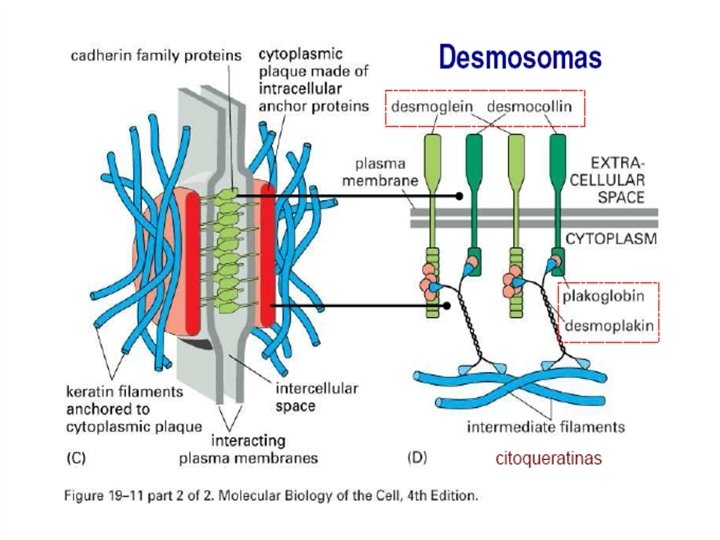 DESMOSOMAS, Contactos intercelulares puntiformes que mantiene unida a la célula , consta de una placa interna de proteína(desmoplaquina y placoglobinas) que se unen a los filamentos intermedios como queratina en la mayoría de células epiteliales o desmina en fibras musculares cardiacas; y proteínas trasmembrana del tipo de cadherina(desmogleinas y desmocolina) que se proyectan al espacio intercelular entrelazándose a las de la otra célula