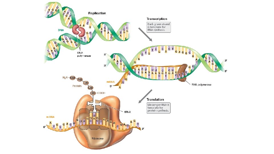 • Genetik bilginin akışı 3 aşamada gerçekleşir: • 1. Replikasyon: Replikasyon sırasında DNA çift iplikçiği iki katına çıkar iki yeni kopyası yapılır. replikasyon DNA polimeraz adı verilen bir enzim tarafından gerçekleştirilir. • 2. Transkiripsiyon: DNA daki genetik bilginin RNA’yua aktarılmasına transkiripsiyon denir. Transkripsiyon RNA polimeraz adı verilen bir enzim yardımı ile yapılır. • 3. Translasyon: m. RNA daki genetik bilginin kullanılarak protein sentezlenmesi translasyon olarak adlandırılır.