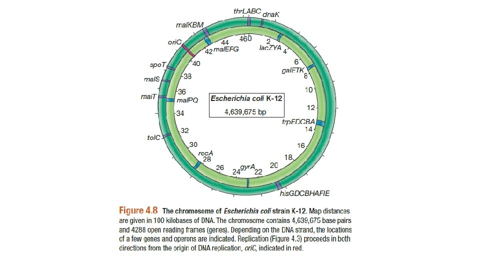 • Escheria coli kromozomundadaki Genlerin Düzenlenmesi • E. coli de dahil bir cok bakteri genomunun dizi analizleri tamamlanmış gen sayıları ve bölgeleri açığa kavuşturulmuştur. Gen yapısının DNA dizi analizleri yapılmıştır. 4639675 bp taşıyan E. coli kromozomu birkaç bin genden oluşmuştur. • Gen harita mesafeleri 100 kbp DNA olarak gösterilmiştir. Genomik analizler muhtemek 4288 proteini kodlayan genin oldugunu bunun toplam genom büyüklüğünün %88’ine karşılık geldiğini ortaya koymuştur. Genomun %1’i t. RNA ve r. RNA ları kodlamaktadır.