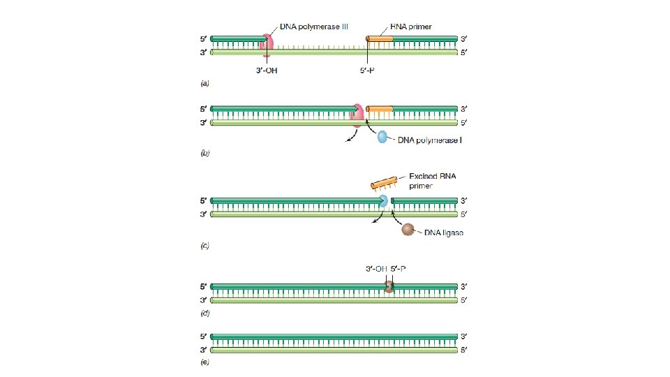 • Sentezde rol alan sonraki enzim olan DNA pol I birden fazla aktiviteye sahiptir. DNA pol I, DNA sentezlemenin yanı sıra var olan RNA primerlerini uzaklaştırıcı 5’ 3’ ekzonükleaz aktivitesine sahiptir. Primer uzaklaştırıldığı ve yeri DNA ile doldurldugu zaman DNA pol I salınır. Son fosfodiester bağı DNA ligaz adı verilen bir enzim tarafından yapılır. Bu enzim 5’PO 4 -2 ve 3’ OH (DNA pol III’un yapamadığı)’a sahip olan DNA’lardaki kırıkları birleştirir ve DNA pol I ile birlikte DNA’nın tamirinde rol oynar.