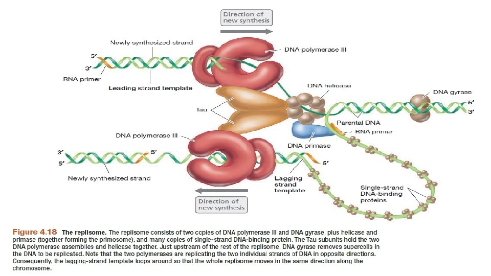 • Replizom • Dna replikasyonu işleminde rol alan proteinler aşırı derecede dinamik olup bir araya geldiklerinde replizom adında büyükbir kompleks oluştururlar. DNA’nın kesintili zinciri dışarı doğru bir halka oluşturarak replizomun her iki zincirde rahatça ilermesine olanak verir. Bu yüzden replikasyon sırasında DNA polimeraz değil DNA hareket eder. • Özet olarak replizom DNA pol III un yanı sıra çok sayıda anahtar protein içerir. 1. Süpersarmalları kaldıran DNA giraz; 2. DNA’yı açan ve primer ekleyen DNA helikaz ve primaz 3. birbirinden ayrılan kalıp zincirlerin tekrar çift sarmal oluşturmasını engelleyen tek zincire bağlanma proteinleri.